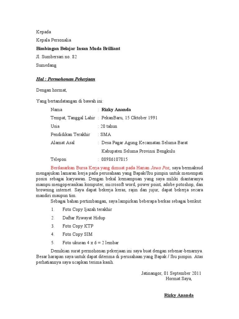 Contoh Surat Lamaran Bimbel : Contoh Surat Lamaran Ngajar Les Kumpulan Contoh Surat Dan Soal Terlengkap : Personal manager of bimbel bahasa inggris mudah.